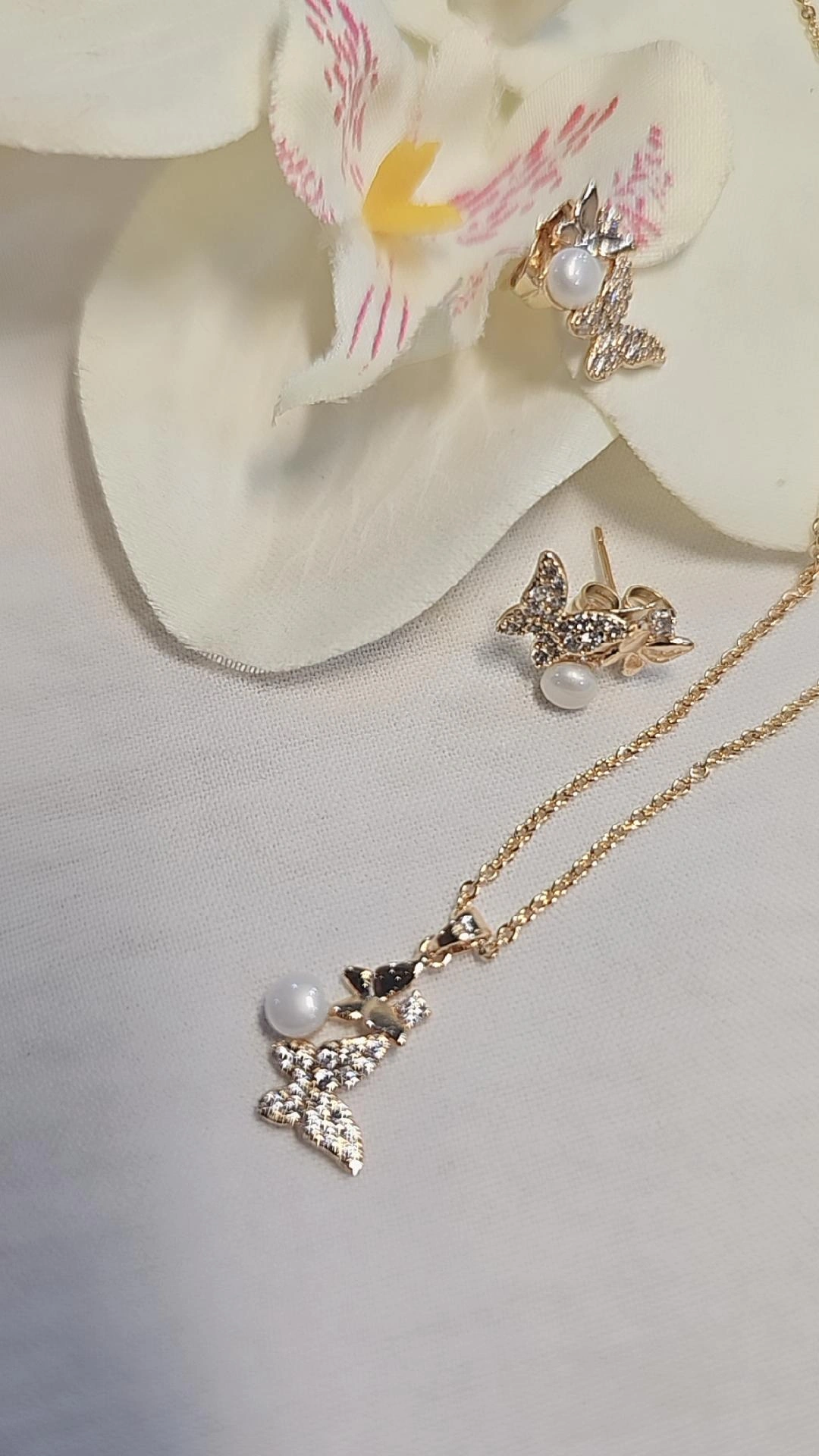 نیم ست مدل پروانه ظریف نگین و مروارید آبکاری طلا رنگ ثابت برند ژوپینگ اصل با نگین بدون ریزشناموجود