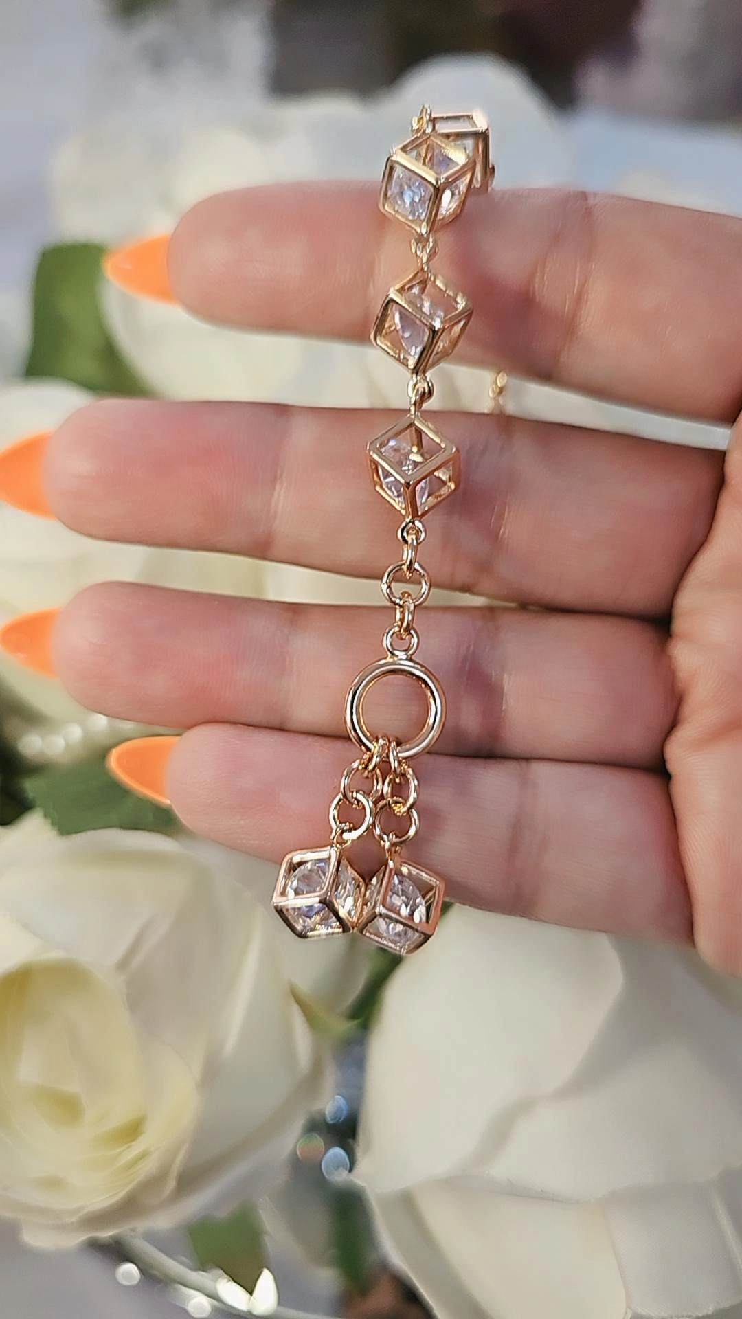 نگینهای درشت محفوظ در مکعبها بسیار منحصر به فرد دور دستان شما پیچیده و زیبایی وصف نشدنی به آنها میدهند