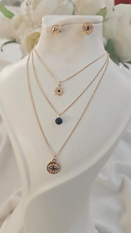 نیم ست چشم اروپایی با سه ردیف گردنبند و گوشواره ترند جنس استیل رنگ ثابت